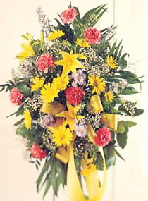 A special friend is always remembered with this standing spray of yellow and pink flowers including lilies, carnations and daisies